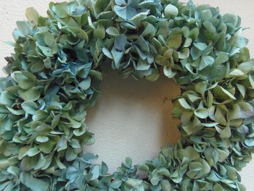もろいアジサイをしっかりとリースにアレンジしています。