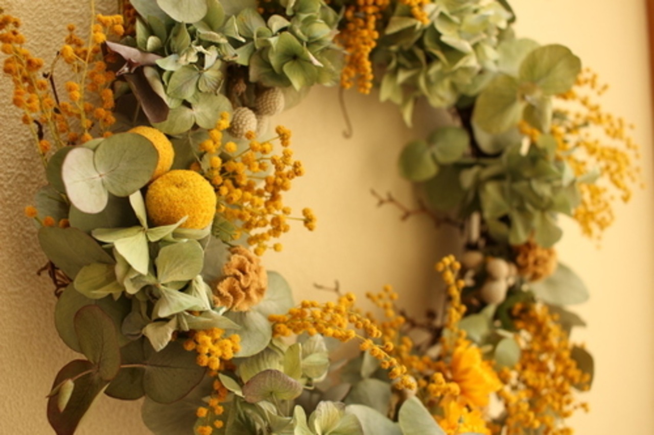 花材:ミモザ、ユーカリ、アジサイ、ヘリクサム、実ものなど