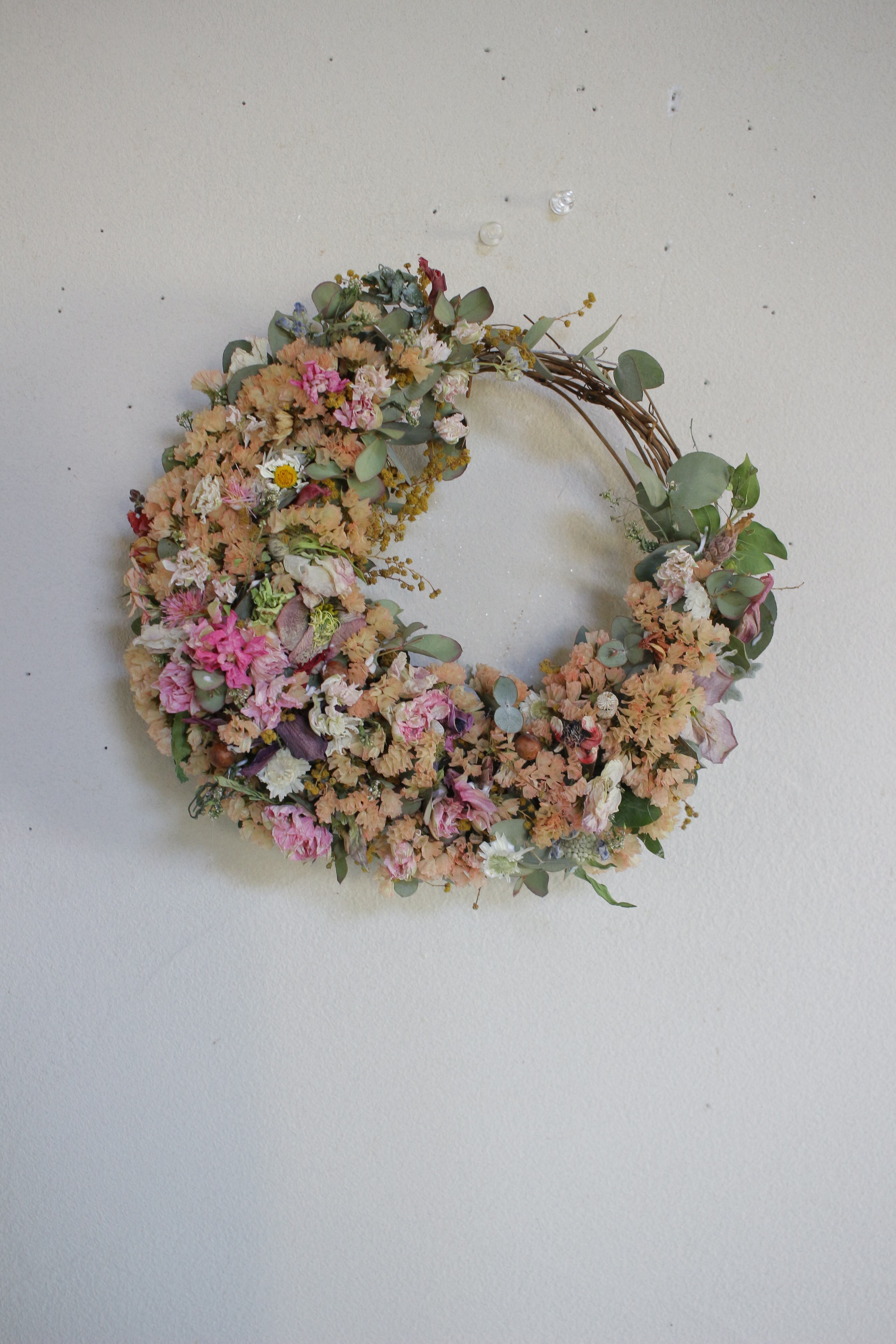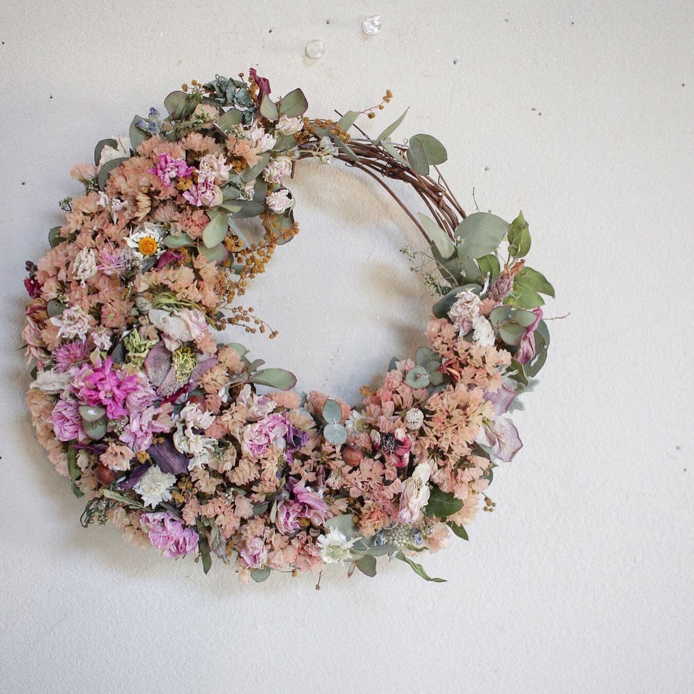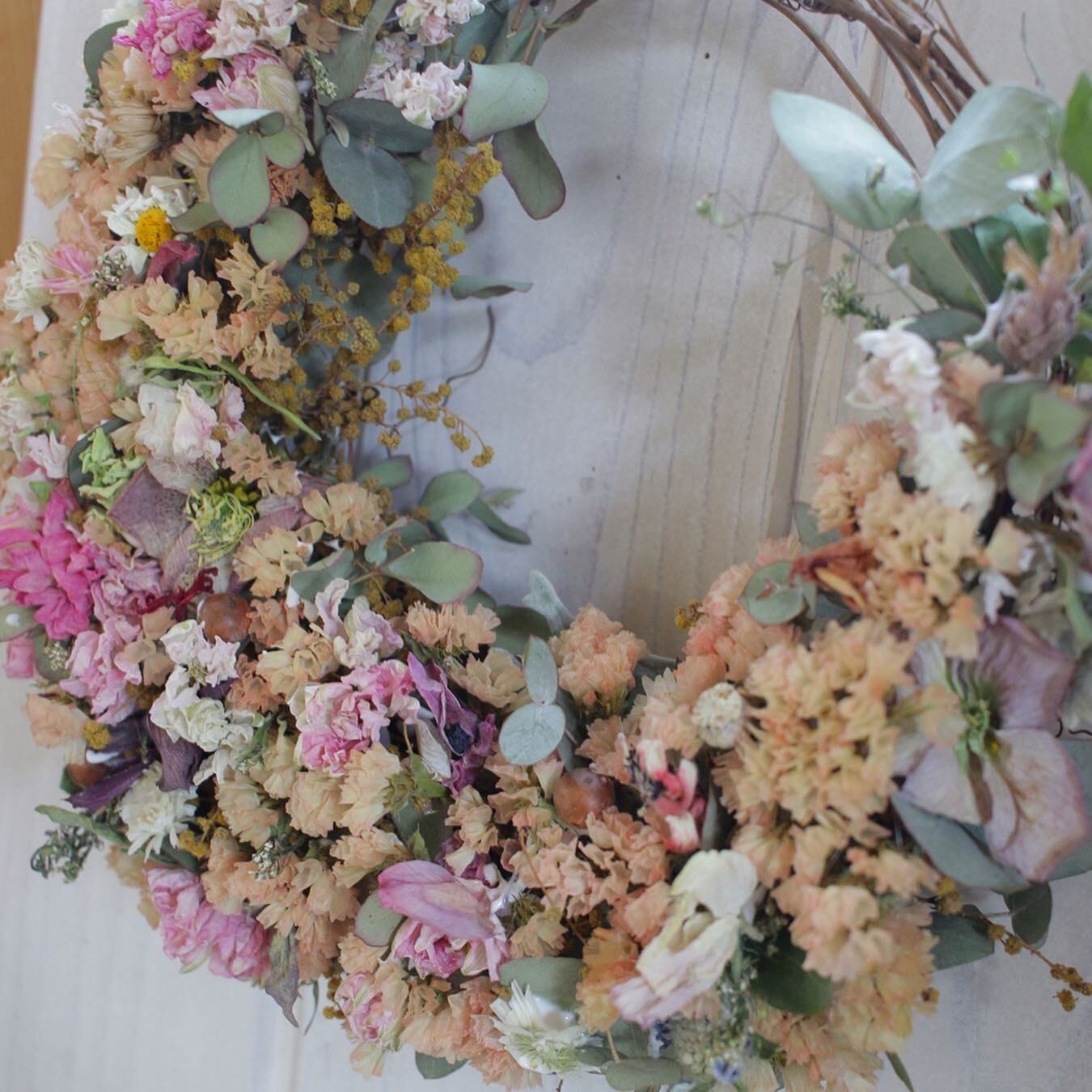 ユーカリ、ミモザの葉、桜色のスターチス、クリスマスローズなど薄ピンクのリースです。