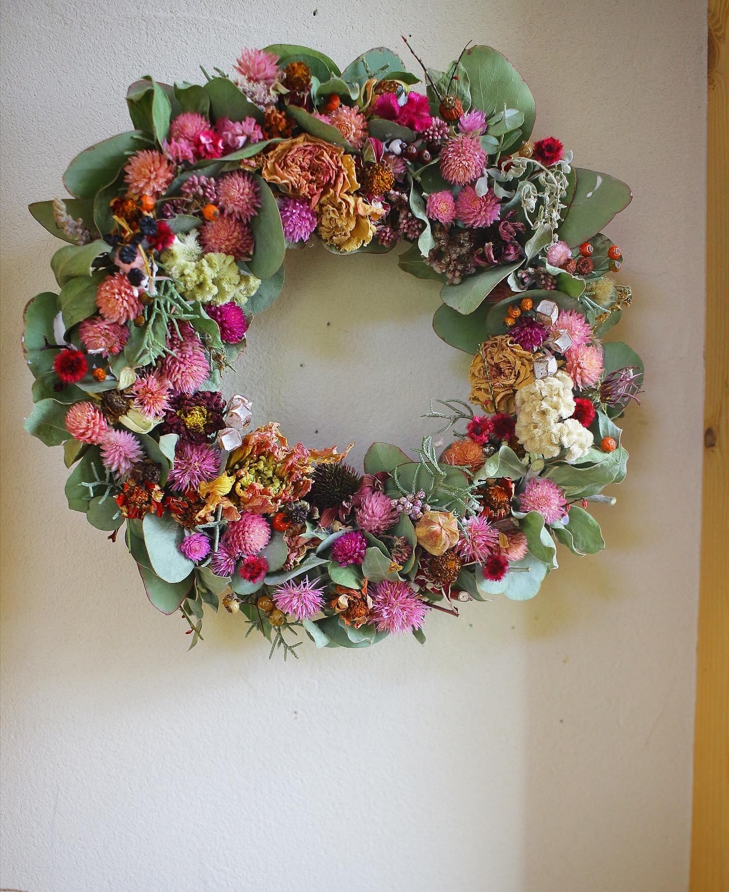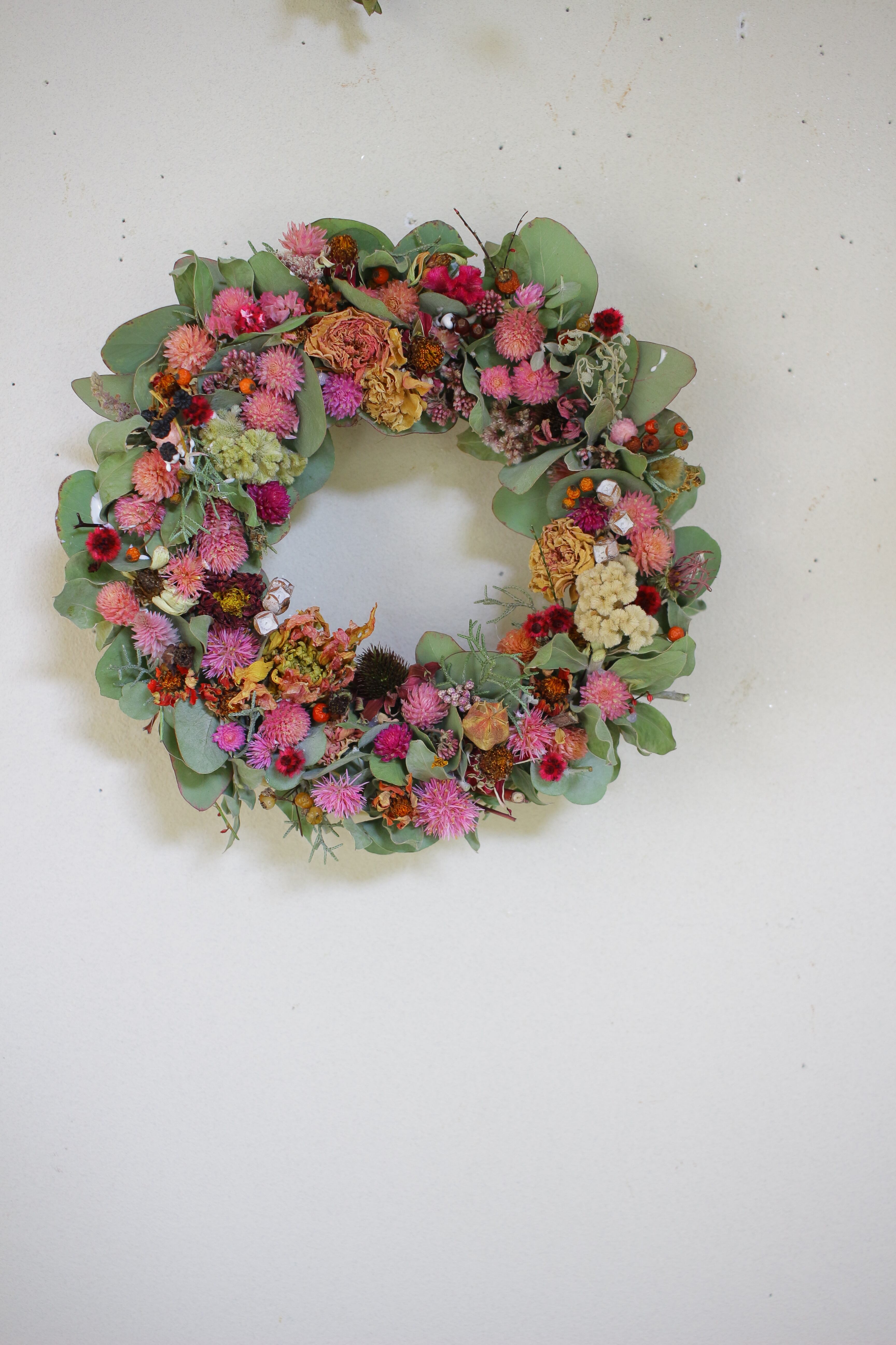 ユーカリ、千日紅、ジニアなどドライフラワーのリースです。