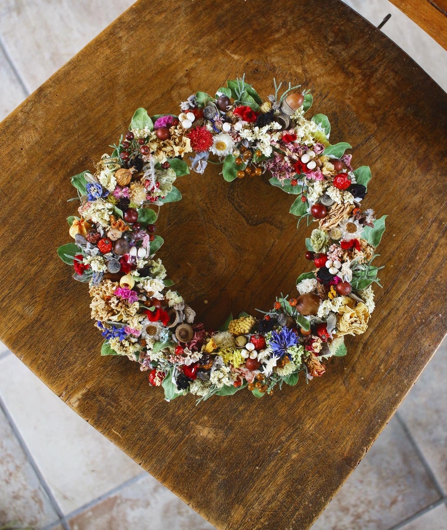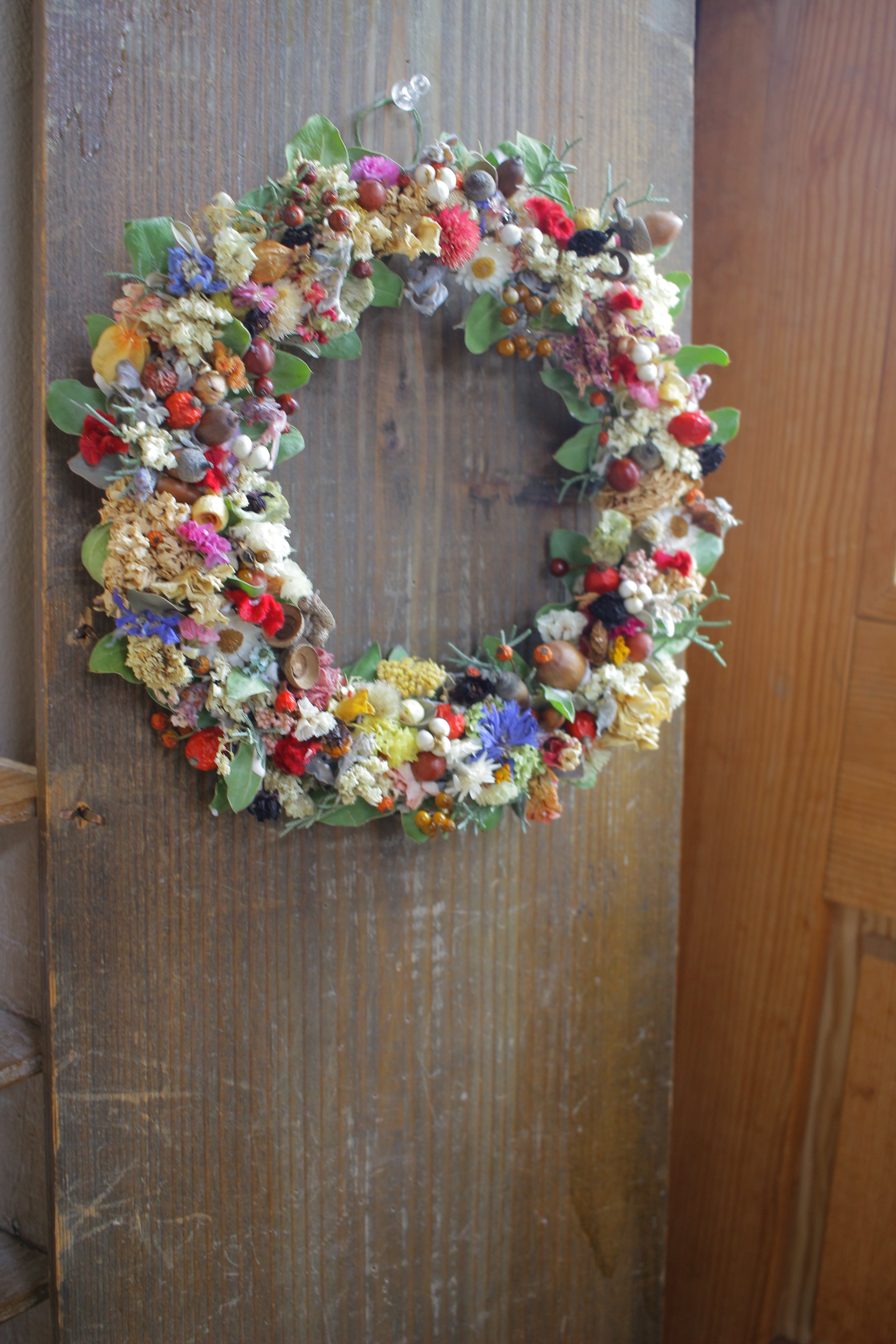 ドングリやナンキンハゼ、サンキライなど小さい木の実をお花畑にギュッと閉じこめました。