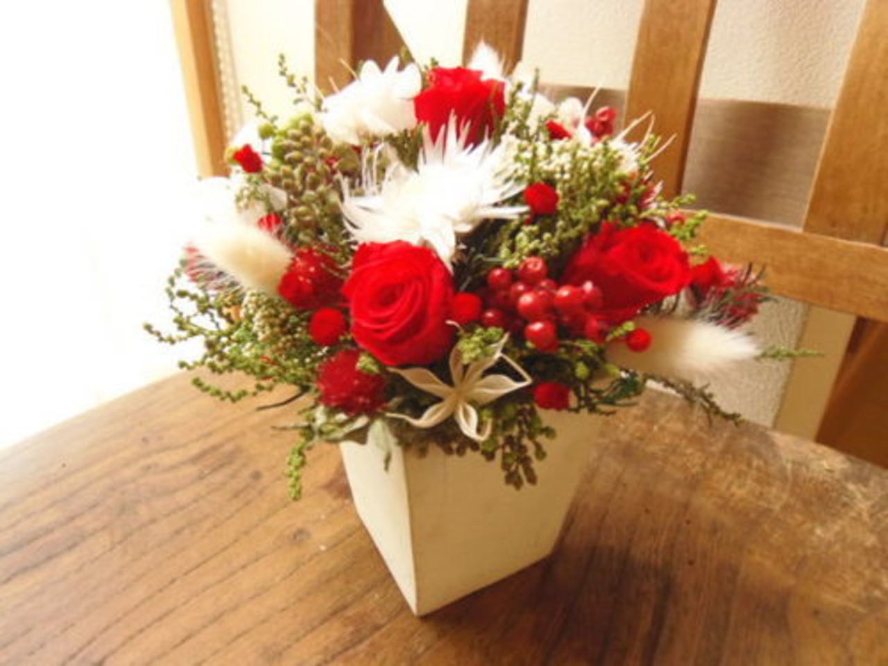 真っ赤なプリザーブドローズの白い木のポットアレンジ