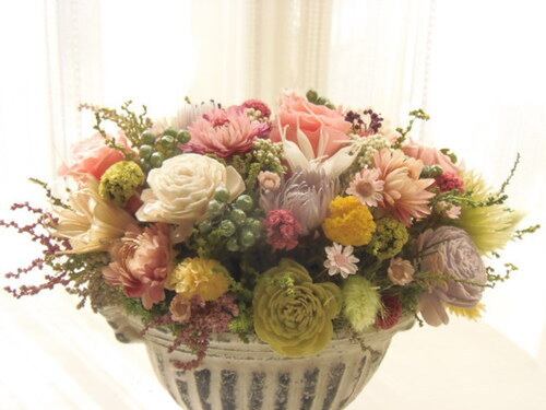アンティークポットにプリザーブドのナチュラルアレンジ パステルカラー