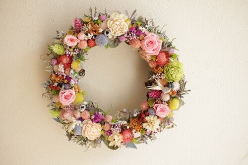 こちらのリースはプリザーブド、ドライフラワーや実物を中心に使用していますので