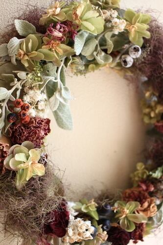 落ち着いた雰囲気のリースで退色してもドライフラワーの雰囲気をじっくりと味わっていただけるリースです。