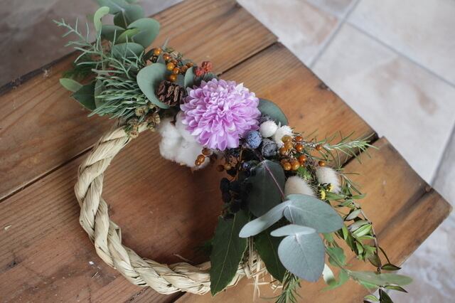 こちらの花材は生の葉、ドライフラワー、アーティフィシャルフラワーなどミックスアレンジとなっております。