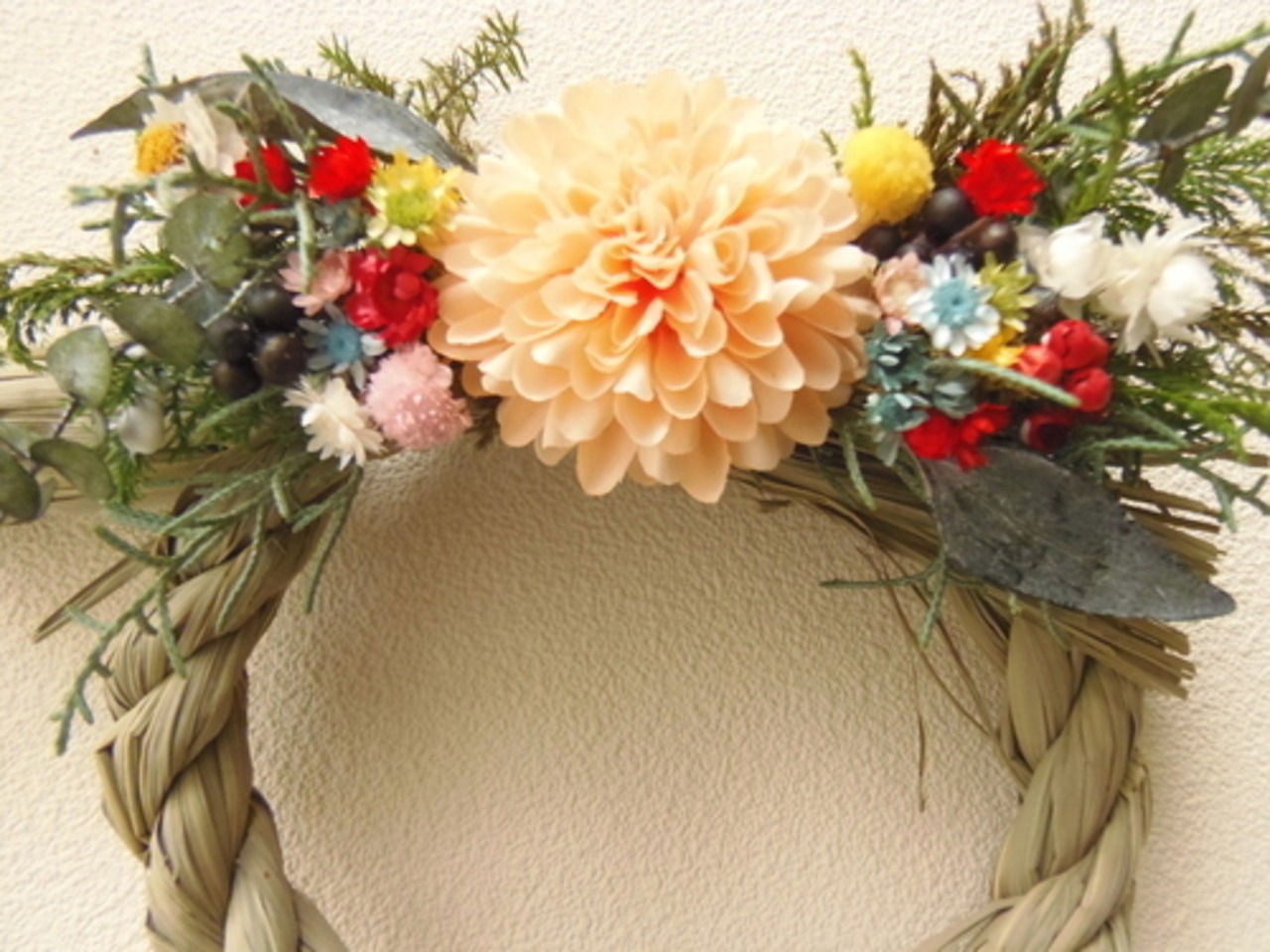 しめ縄アレンジ リース型 ピーチピンクとカラフル小花
